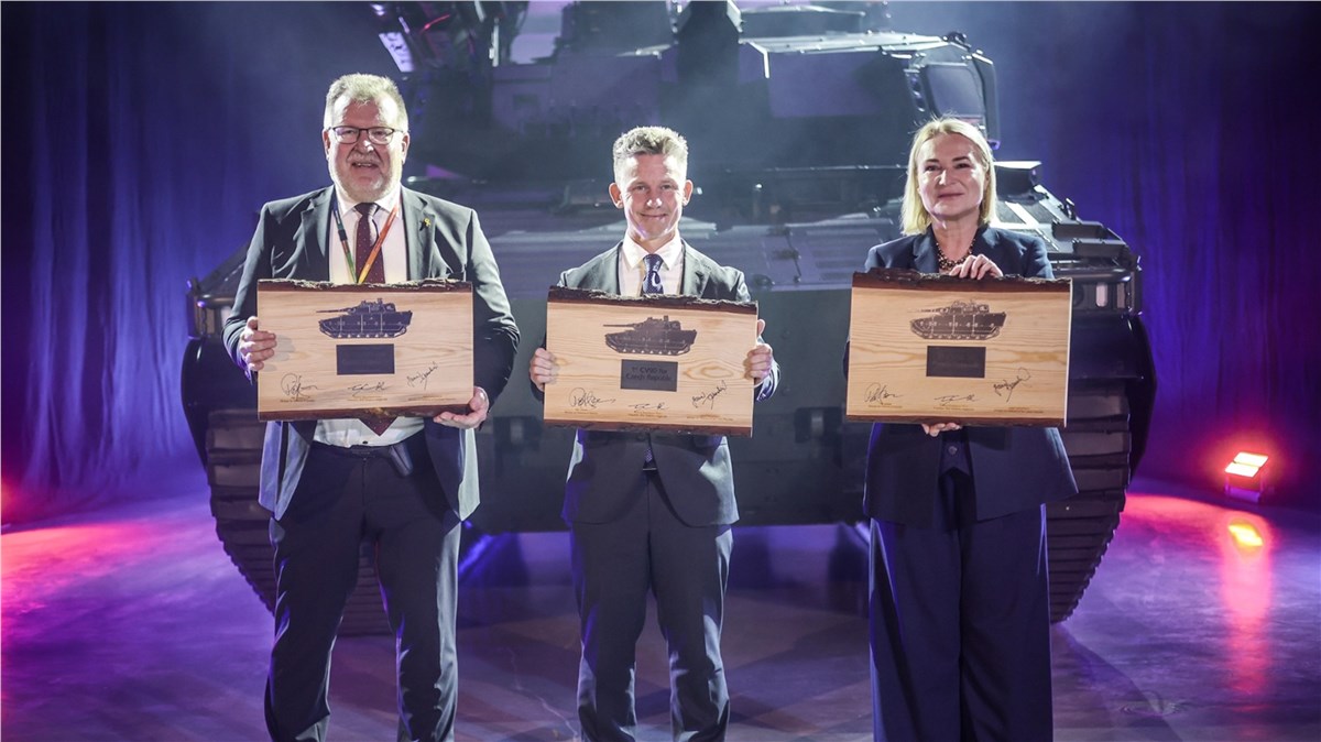 BAE Systems Hägglunds Managing Director Tommy Gustafsson-Rask, Czech Defence Minister Jana Cernochová, and Swedish Defence Minister Pål Jonsson mark the milestone with commemorative plaques, standing proudly in front of the first CV9030 MkIV vehicle.