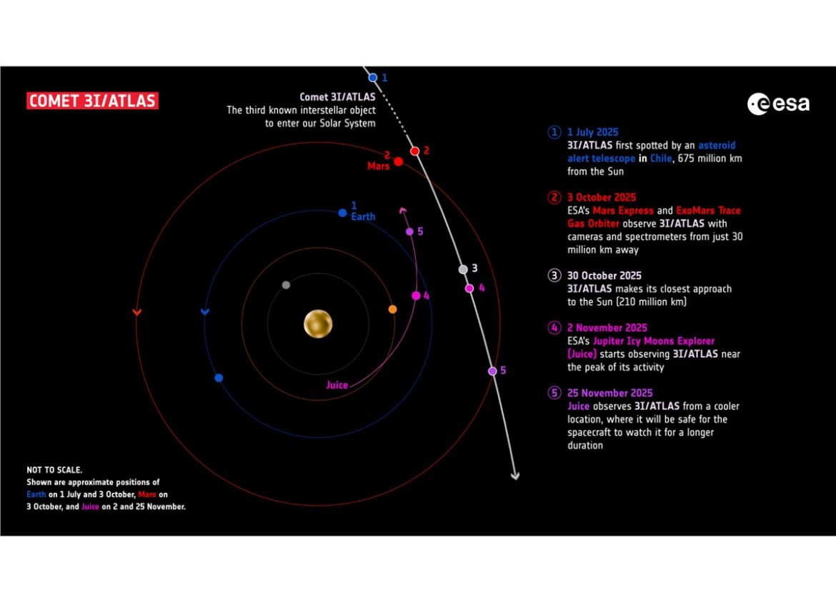 In a unique celestial event, ESA’s ExoMars Trace Gas Orbiter (TGO) and Mars Express successfully observed the interstellar comet 3I/Borisov, also known as 3I/ATLAS, as it passed near the Red Planet between 1 and 7 October. The two Mars orbiters provided the closest perspective of all ESA spacecraft, capturing valuable data as the comet made its closest approach on 3 October, coming within 30 million kilometres of the planet.
